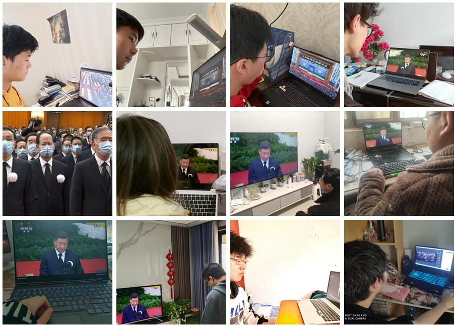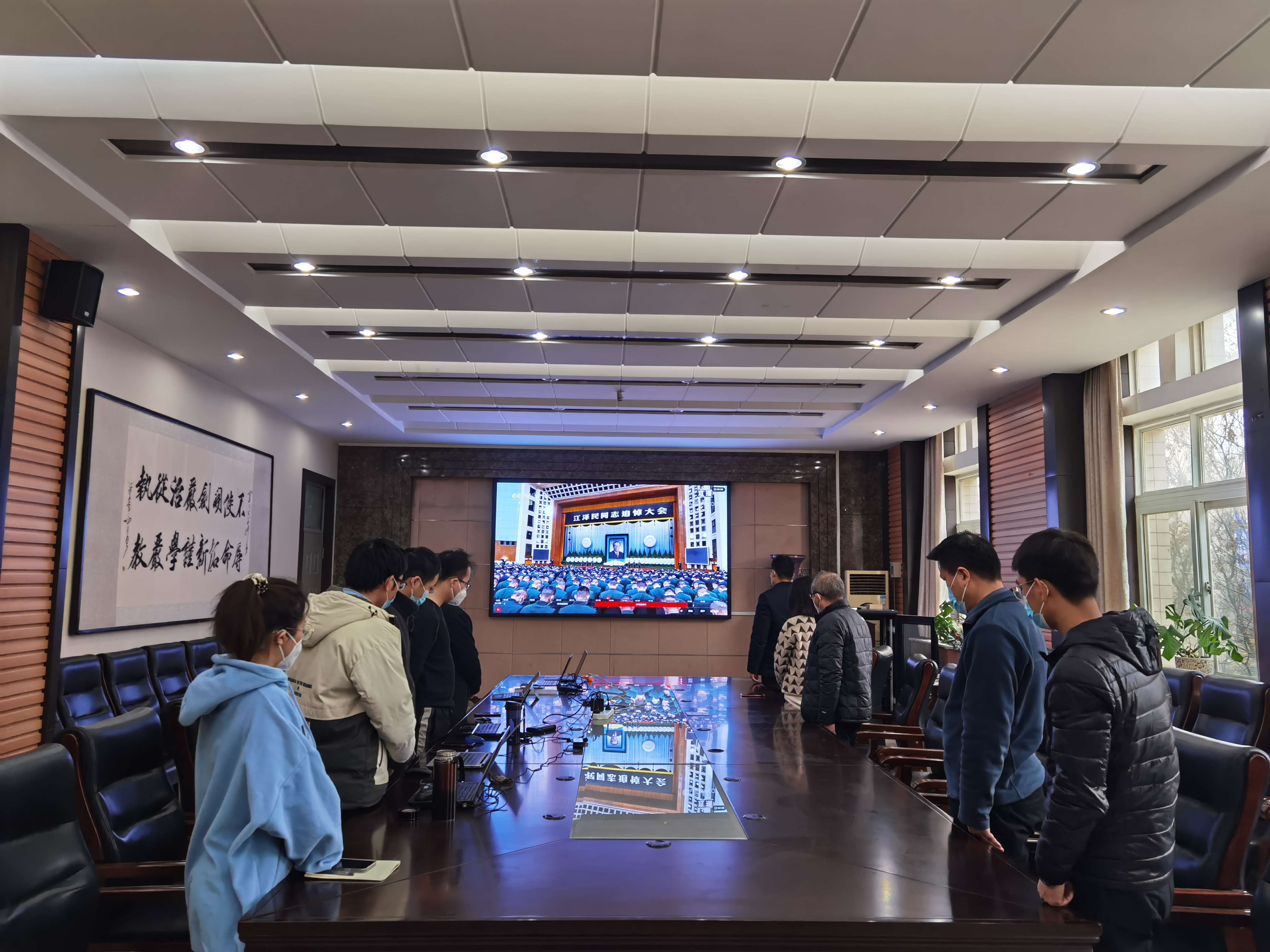 师生以线上线下结合的方式收听收看追悼大会,学院院长张庆辉、副院长秦瑶和留校值班教师在6225会议室集中收看追悼大会直播,沉痛悼念江泽民同志。