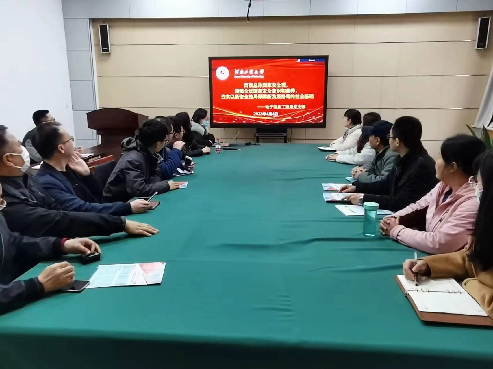 2023年4月15日是第八个全民国家安全教育日,为深入宣传以习近平同志为核心的党中央关于总体国家安全观、国家安全工作的重大部署和要求,突出“贯彻总体国家安全观,增强全民国家安全意识和素养,夯实以新安全格局保障新发展格局的社会基础”主题,进一步提升教师的国家安全意识,电子信息工程系教工党支部全体教师于4月4日下午在6412会议室召开“维护国家安全,共筑钢铁长城”国家安全教育日主题党日活动。会议由党支部书记付麦霞主持,宣传委员杨静老师主讲,傅洪亮副院长出席参加。