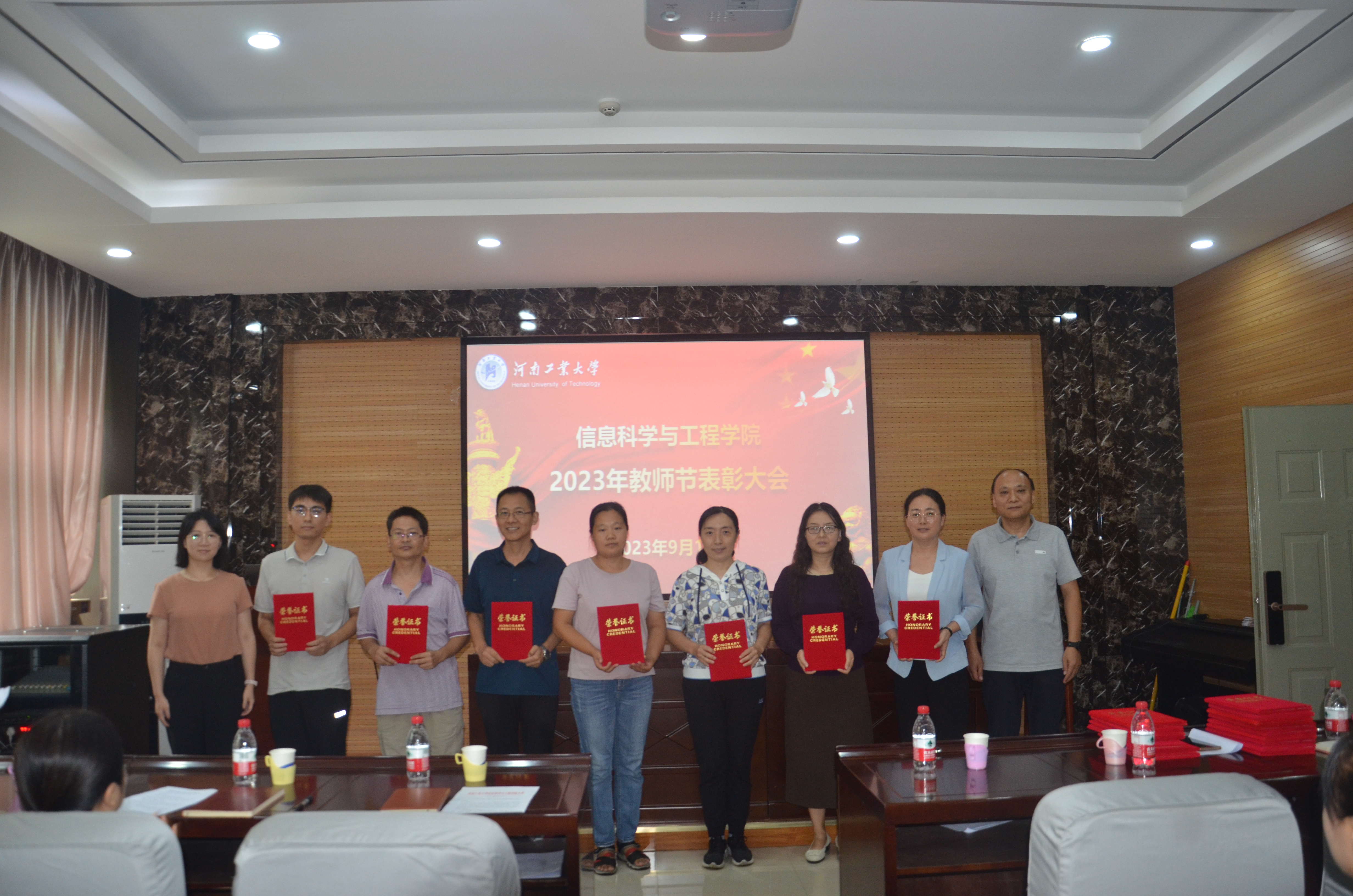 《关于表彰2022-2023年度先进教师的决定》,隆重表彰过去一年在党建、教学、科研、学生管理和工会工作中涌现出来的先进个人。与会院领导郭晓旻、孙丽君、傅洪亮、秦瑶、刘宏月分别颁发荣誉证书,并与获奖者合影留念。