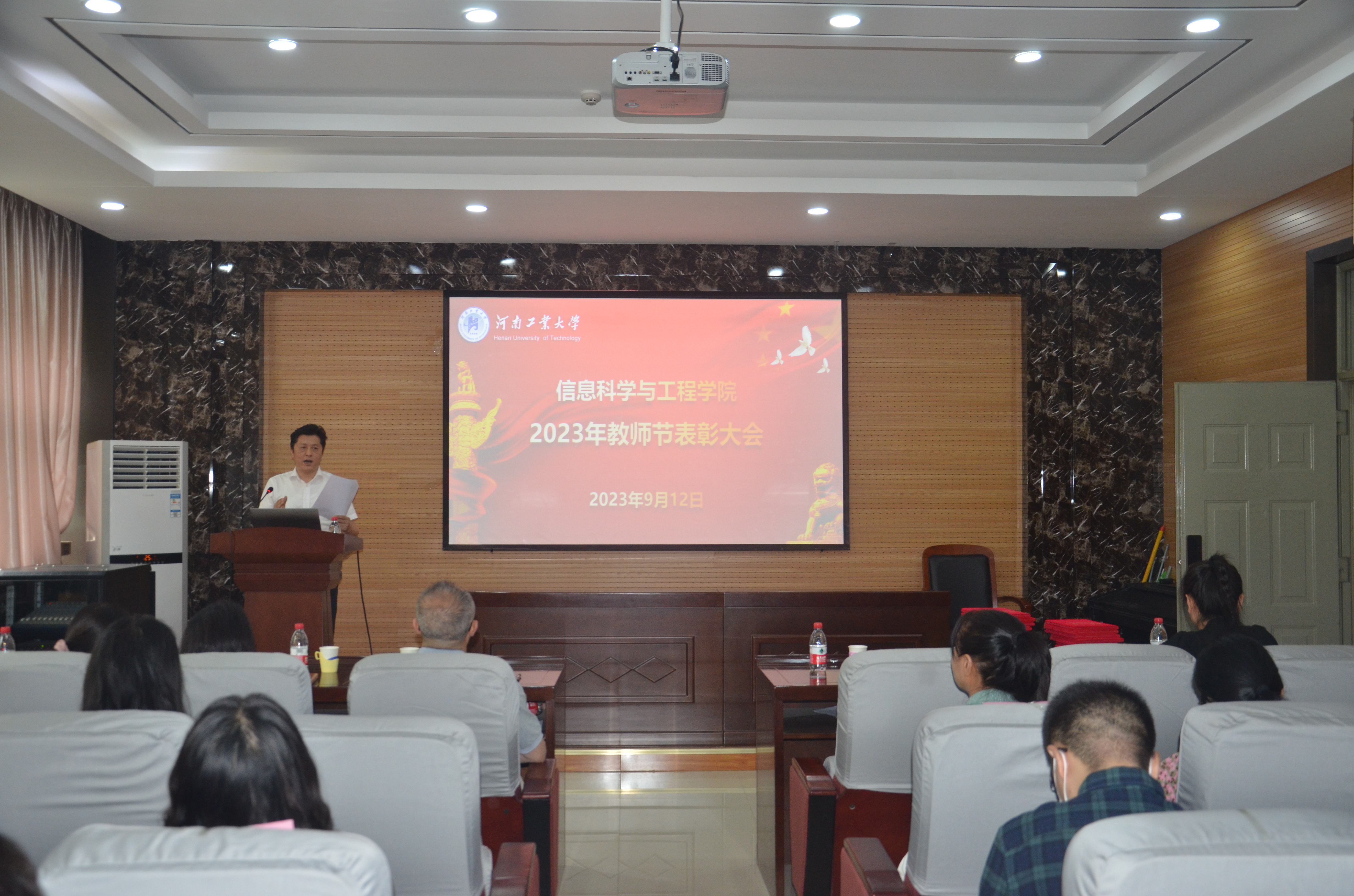 在6228会议室举行庆祝第39个教师节表彰大会,大会以“躬耕教坛,强国有我”为主题。学院领导班子和全体老师参加会议,会议由学院党委书记郭晓旻主持。