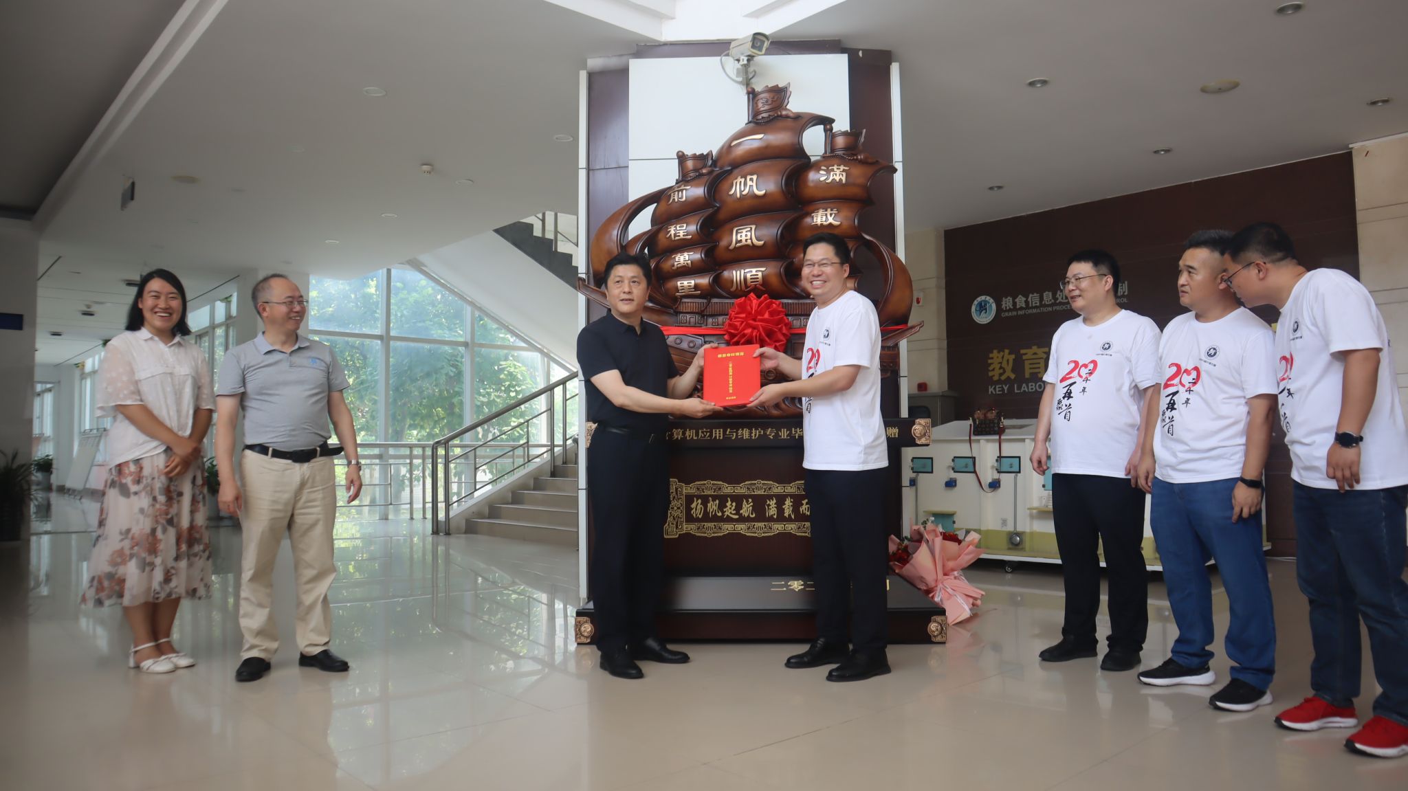 为了表达对母校的感激之情,校友们为学院精心准备了一份纪念品——木雕帆船,赠送给母校。这份礼物不仅代表了校友们对母校的深厚感情,也象征着他们对学弟学妹们未来发展的美好祝愿。在学院楼前,校友们留下了珍贵的合影。他们笑容满面,仿佛回到了那个充满梦想的青春时代。这一刻,他们共同见证了彼此的成长和变化,也见证了母校的发展壮大。