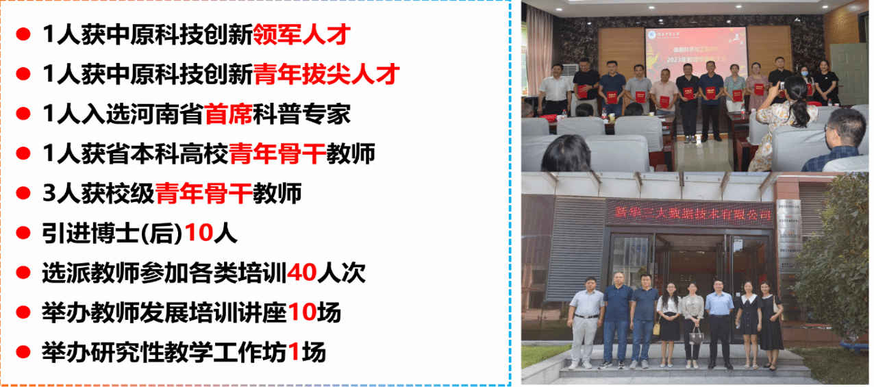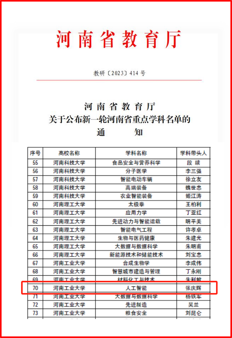 锻强特色优势,学科建设有突破。学院始终坚持以学科建设为龙头,全力推动学院高质量发展。2021 年,成功获批“控制科学与工程”一级博士学位授权学科。“计算机科学与技术”学科在教育部第五轮学科评估中荣获 C 类,在行业和省内高校中保持领先优势。学院申报的“控制科学与工程”获批河南省“双一流”后备学科建设项目,“人工智能”交叉学科顺利入选河南省新一轮重点学科,“人工智能与智慧粮食”学科群成功跻身河南省特需急需特色骨干学科群培育建设名单。