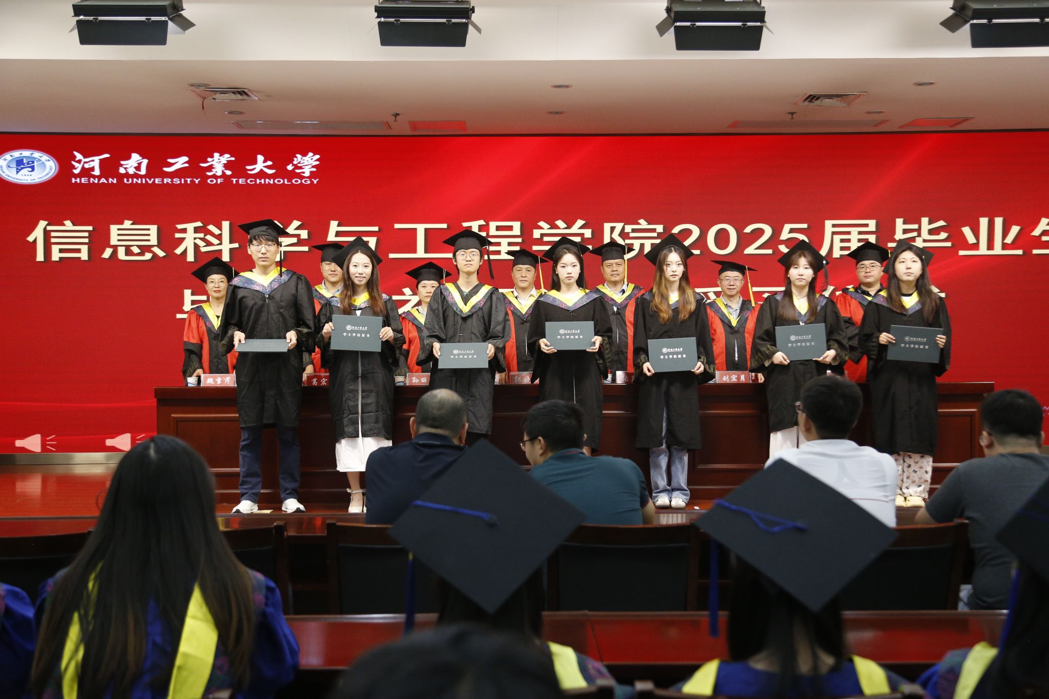 学院领导班子成员为全体硕士毕业生和本科毕业生逐一行拨穗礼、颁发学位证书并合影留念。