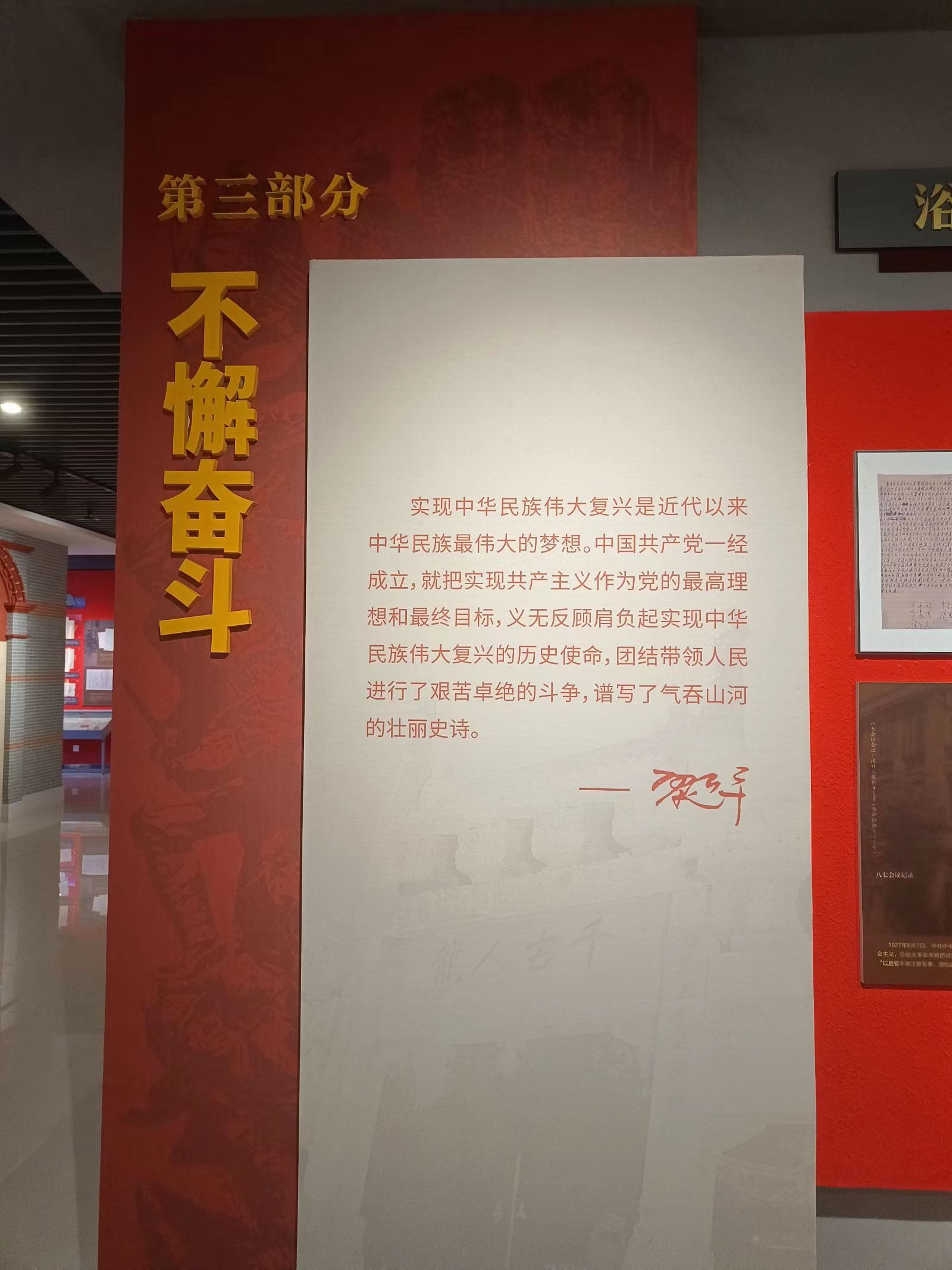 在讲解员的带领下,成员们对此展馆活动的第三部分进行参观,了解到实现中华民族伟大复兴是中华民族近代以来最伟大的梦想。中国共产党一经成立,就把实现共产主义作为党的最高理想和最终目标,义无反顾地肩负起实现中华民族伟大复兴的历史使命,带领中国人民进行了艰苦卓绝的斗争,谱写了气吞山河的壮丽史诗。