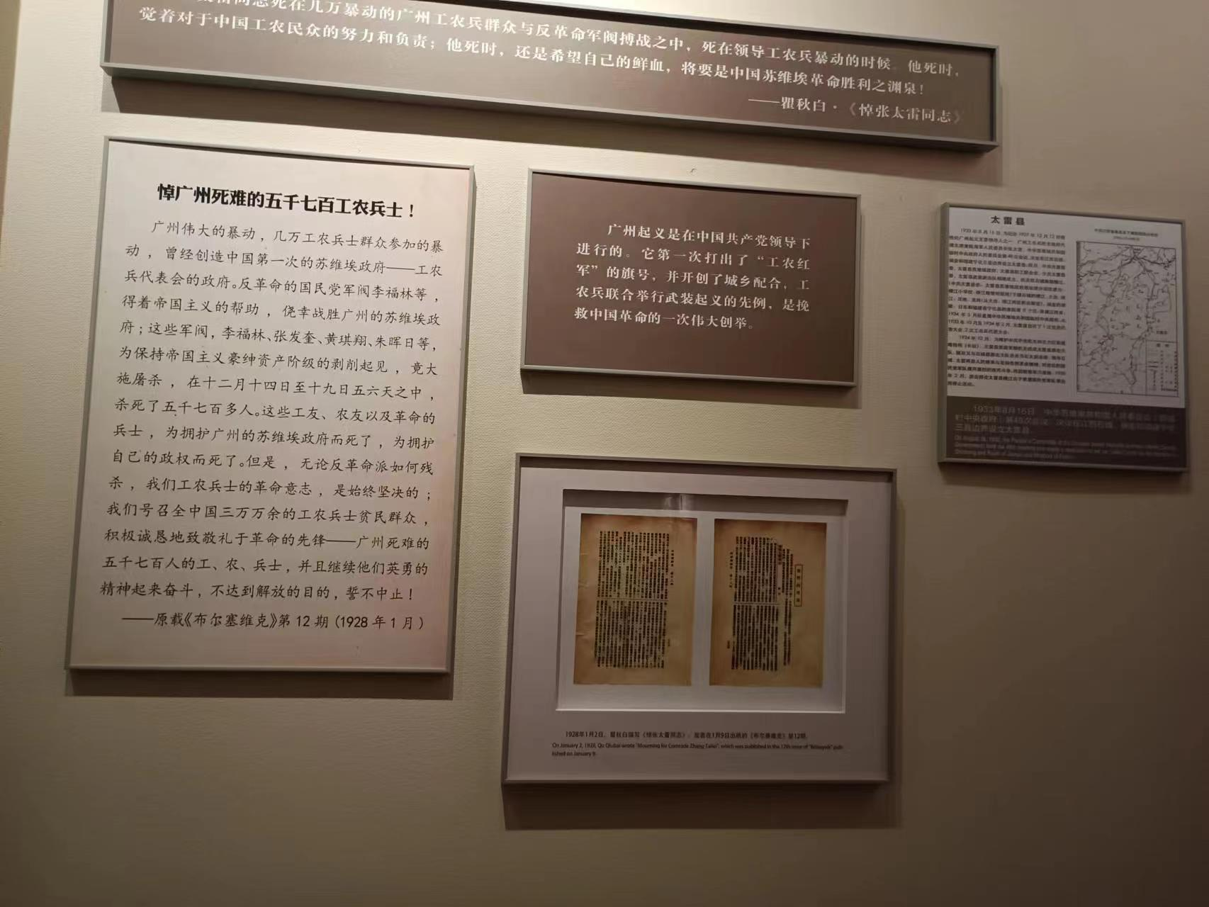 走进二楼,来到革命的高潮,在八七会议之后,张太雷主动请求去广东工作,从事武装反抗国民党反动派的斗争。1927年12月11日,他以中共广东省委书记、革命军事委员会主要成员的身份参与领导了广州起义。在起义中,张太雷等率领起义军与国民党粤系军阀部队进行了顽强战斗。12月12日,他乘车前往战斗前沿,遭敌伏击,壮烈牺牲。张太雷是新民主主义革命