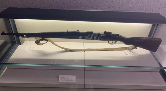 1932年,杨靖宇受党中央的委托,到东北组织抗日联军,带领军队和人民浴血奋战。在抗战过程中,他有勇有谋,多次领导抗联队伍挫败日军,在敌我力量差距悬殊的情况下依然重创日军,化险为夷。当时,杨靖宇带领的部队被日寇称为“东边道社会治安之癌”,他所带领的抗联活动地区被称为“癌肿地带”,可见其对日寇的震慑力之大。图三为纪念馆内展出的杨靖宇在抗战过程中夺得的第一支38式步枪。