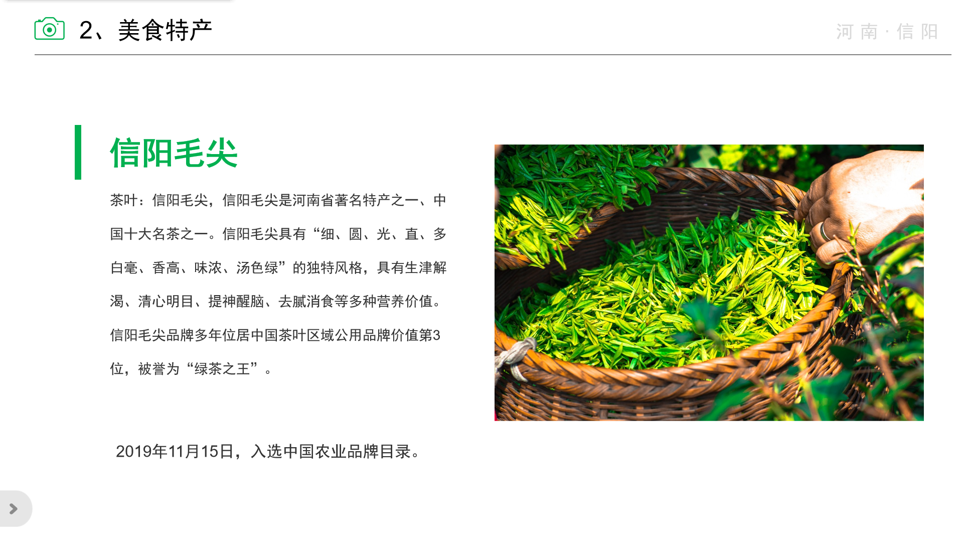 通过对南湖湾风景区和鸡公山风景区的介绍,展示了信阳的自然美景;信阳毛尖和南湾鱼的介绍,则让观众领略了当地的美食特色。此外,信阳皮影戏和花鼓戏的讲解,展现了信阳丰富的地域文化。