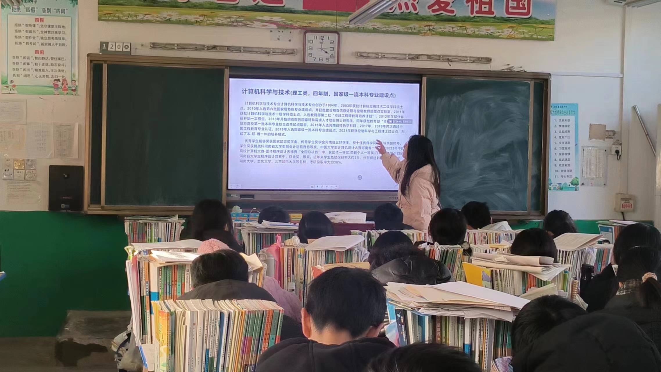 的宣讲资料后,“回校宣传之工大小分队”实践团队来到了虞城县高级中学。虞城县高级中学副校长杜老师及高三4班班主任邓老师对其表示热烈的欢迎。然后邓老师带领着实践团队来到了高三4班,向4班学子介绍了实践团队的成员并向他们说明了其目的。接下来,“回校宣传之工大小分队”实践团队成员向4班全体学生展示河工大的宣传视频并给他们分发宣传手册。