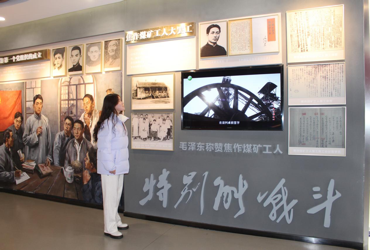 在焦作市党史展览馆内,团队成员开展了党史学习教育,深入学习党的百年奋斗历程。团队成员首先认真观看了“焦作煤矿工人大罢工”的影视纪录片,了解到在1925年,中国正处于半殖民地半封建社会的深重苦难之中,工人阶级面临着残酷的剥削和压迫。焦作煤矿的工人们在中国共产党的领导下,响应上海“五卅运动”的号召,发起了大罢工。团队成员表示,焦作煤矿工人大罢工展示了中国工人阶级在中国共产党领导下的强大力量,毛泽东在《中国社会各阶级的分析》中盛赞焦作煤矿工人“特别能战斗”,这一评价体现了对工人阶级斗争精神的高度评价。