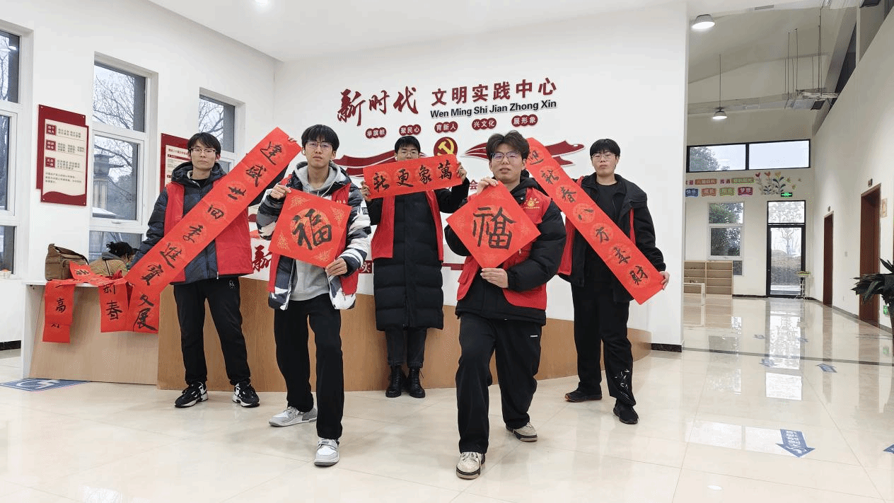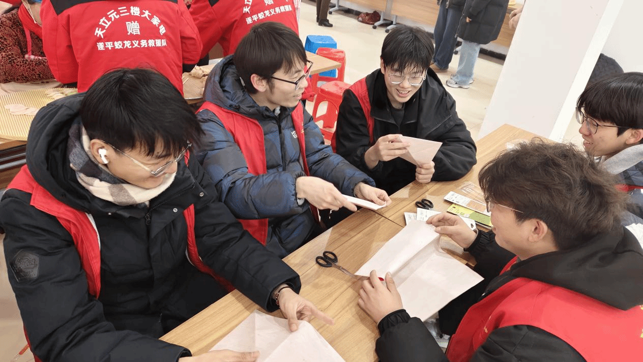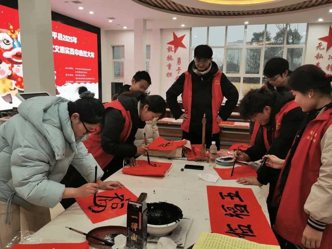 返乡大学生志愿者们纷纷摆开笔墨纸砚,一展身手。红红的春联纸在桌上铺开,大家尽情书写自己的新春心愿。