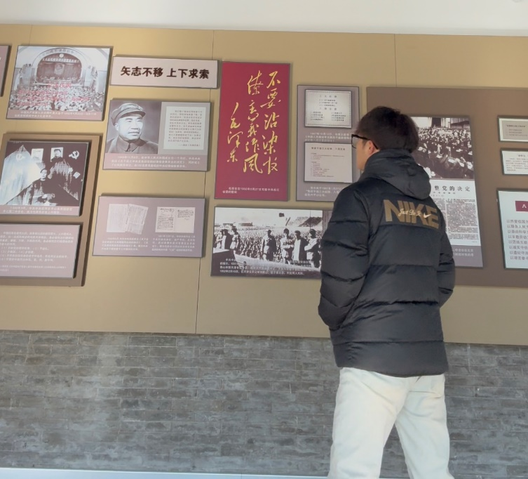 其中一位成员在纪念馆标志性的“矢志不渝 上下求索”字样前驻足良久,仔细观看下方陈列的展板,想象着当年热血青年在此学习、为革命事业拼搏的场景。