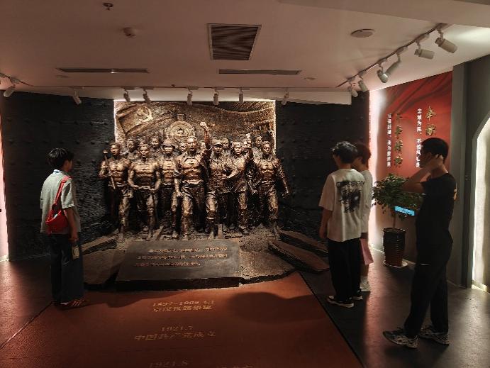 7月2日上午10时20分,实践团成员怀着崇敬的心情步入纪念馆。在讲解员的带领下,成员们依次参观了“京汉铁路的修建与早期工人运动”、“京汉铁路总工会的成立”、“二七大罢工”、“英勇悲壮的二七惨案”和“永恒的纪念”等主题展厅。一幅幅泛黄的照片、一件件锈迹斑斑的实物、一份份珍贵的文献手稿,将百年前工人阶级为争取自由和权利而进行的那场惊心动魄的斗争生动呈现。特别是在“二七”烈士林祥谦、施洋等革命先驱的展区前,成员们驻足沉思,深刻感受到先烈们“头可断、工不可复”的凛然正气和视死如归的英雄气概。