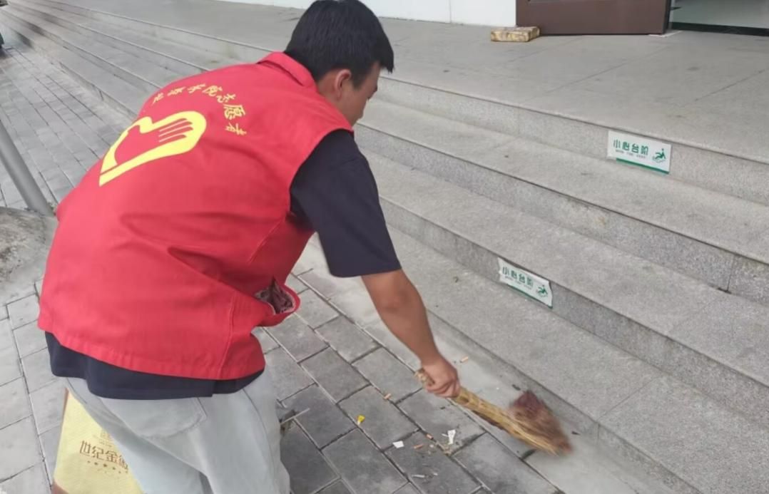 清运组的队员们刚上手就遇到了难题:废弃瓷砖边缘锋利,徒手搬运容易划伤。社区保洁员王师傅见状,主动拿来 10 副厚手套和 2 辆手推车,“这些瓷砖得轻拿轻放,碎块要单独装袋,不然扎破垃圾袋更麻烦。” 队员们听从指导,两人一组抬运整箱瓷砖,其他人则用铁锹将碎块归拢,再装入厚实的建筑垃圾袋。烈日下,队员们的 T 恤很快被汗水浸湿,脸上沾着灰尘,但没人停下休息。清洁组的工作同样不轻松,花坛里的塑料瓶被泥土埋了一半,队员们得蹲在地上用夹子一点点抠;公告栏上的小广告用胶水粘得极牢,队员汪明超发现先用水浸湿再铲的方法更有效,便立刻分享给其他队员,原本斑驳的公告栏渐渐露出干净的底色。