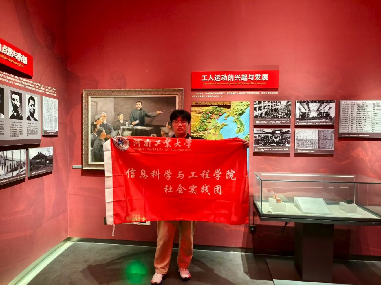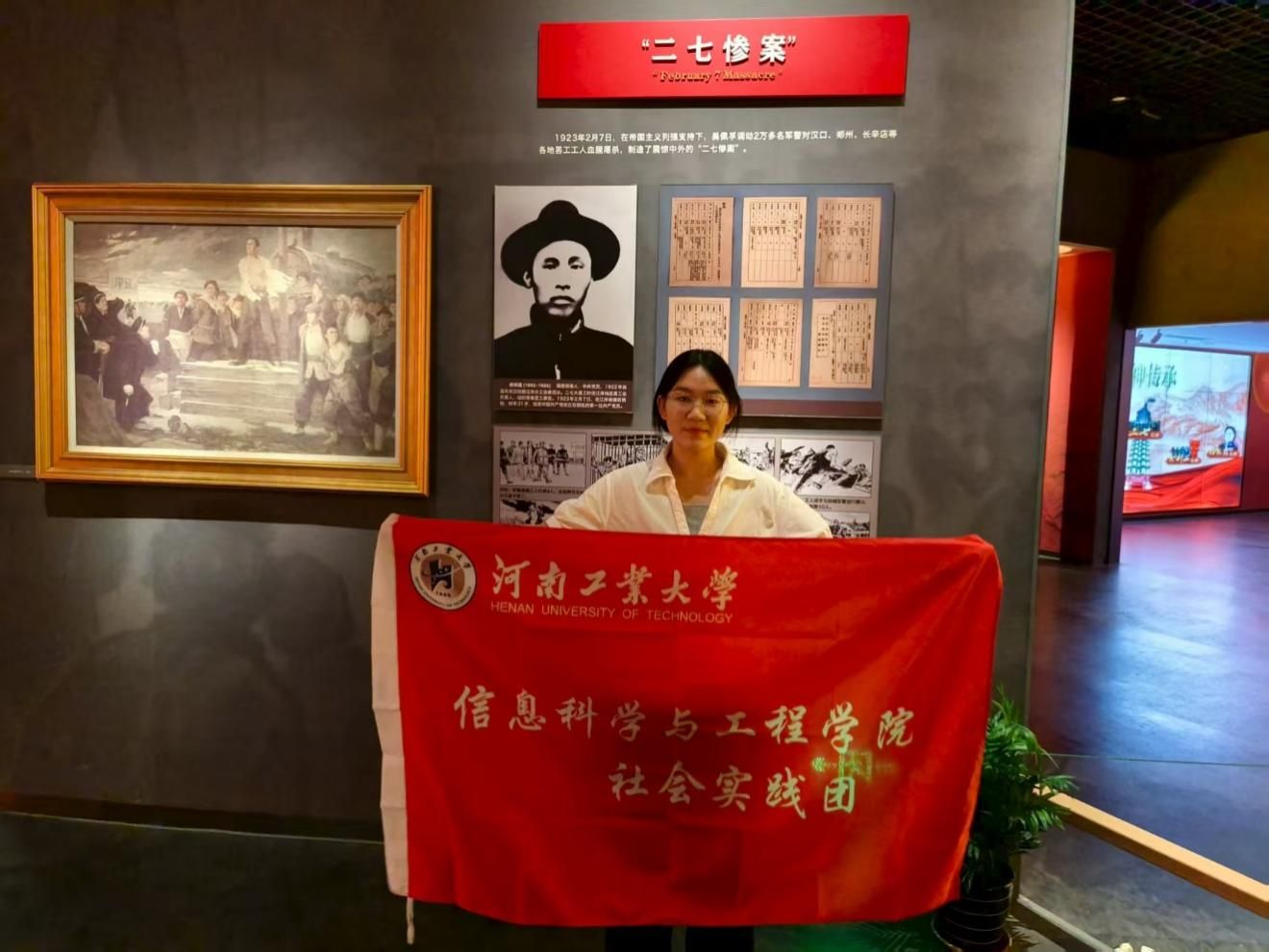 为深入探寻二七故事与二七精神,社会实践队员们怀着崇敬的心情对二七纪念堂“铁路修建”、“星星之火”、“革命烈焰”、“永恒丰碑”、“精神指引”、“传承弘扬”、“红色地标”、“城市记忆”和“百年辉煌”这九个部分进行了详细的参观。在参观过程中,团队成员在二七纪念堂内沿着展览区缓缓前行,仔细观看每一处史料,认真阅读革命先烈的光辉事迹,深刻了解了“工人运动的兴起与发展”的起因、经过以及深远影响。在参观完二七纪念堂后,团队成员们对二七故事与二七精神进行了深刻的讨论,感受到了工人团结一心、不屈不挠、敢于抗争的革命精神,被工人们的强大力量所感染,也对郑州这座城市有了新的认识。
