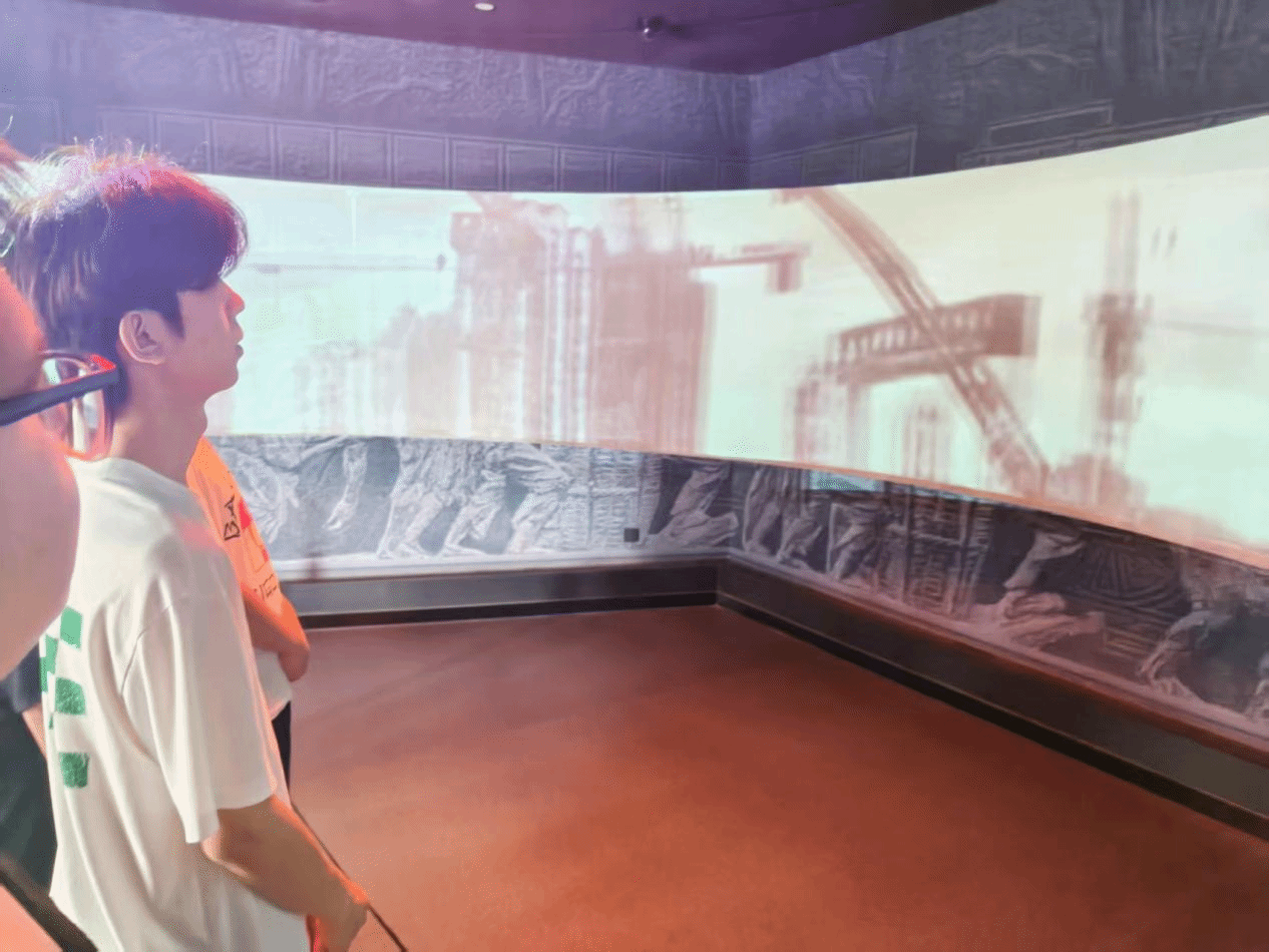 图 4 队员参观二七塔内展品 图5 队员观看二七塔内影像
