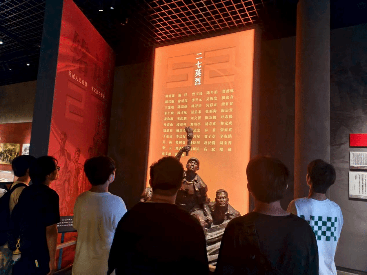 2024年8月28日上午,小队前往二七广场,驻足于广场中心的纪念雕塑前,感受红色地标与城市发展的交融,体会红色历史在当代的传承与延续。最后,小队走进二七纪念塔,沿着参观路线逐层了解郑州近现代发展历程中与红色历史相关的印记,通过文字、图片、场景复原等展陈形式,进一步梳理二七工人运动对河南乃至全国工人运动发展的影响。参观过程中,小队成员围绕“二七塔建筑设计与红色精神的关联”“新时代如何活化利用红色地标”等问题展开记录与讨论,深入理解二七纪念塔作为“红色教育基地”的功能与价值。