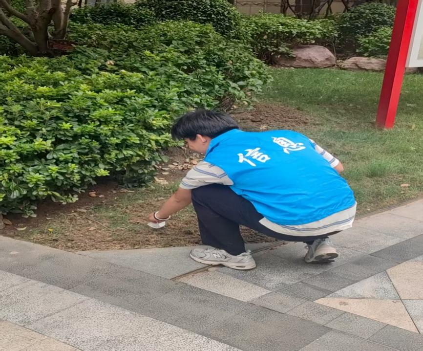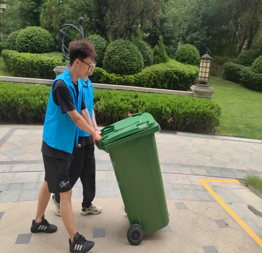 与此同时,社区绿化带及公共区域内,杨开铭同学正带着工具清理垃圾。他沿着花坛逐一捡拾塑料瓶、废纸等杂物,遇到卡在灌木丛中的烟头,便蹲下身用手仔细掏出。“小区环境好了,大家住着也舒心。”杨开铭同学擦了擦额头的汗说。不远处,郭梓晨、胡毅豪五同学正协助社区工作人员整理堆放的废旧杂物。他们将纸箱、旧家具等分类打包,再用垃圾车将垃圾转运至指定垃圾回收点,原本杂乱的储物间逐渐变得整洁有序。社区物业的师傅点赞道:“这些学生不怕脏不怕累,帮我们解决了大麻烦。”