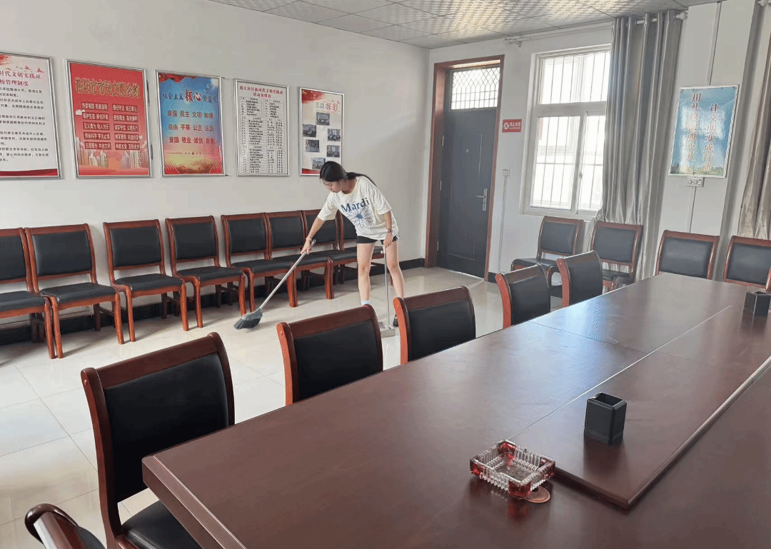 贾若熙也积极参与基层服务,打扫社区卫生,整理社区会议室为会议做准备,以及打扫办公室等等。