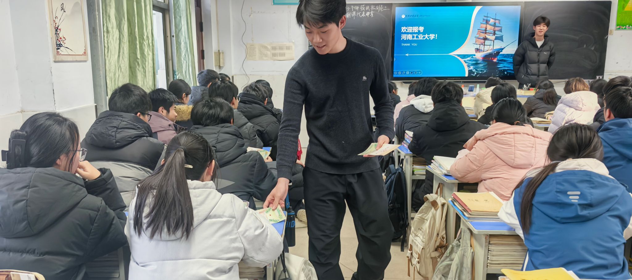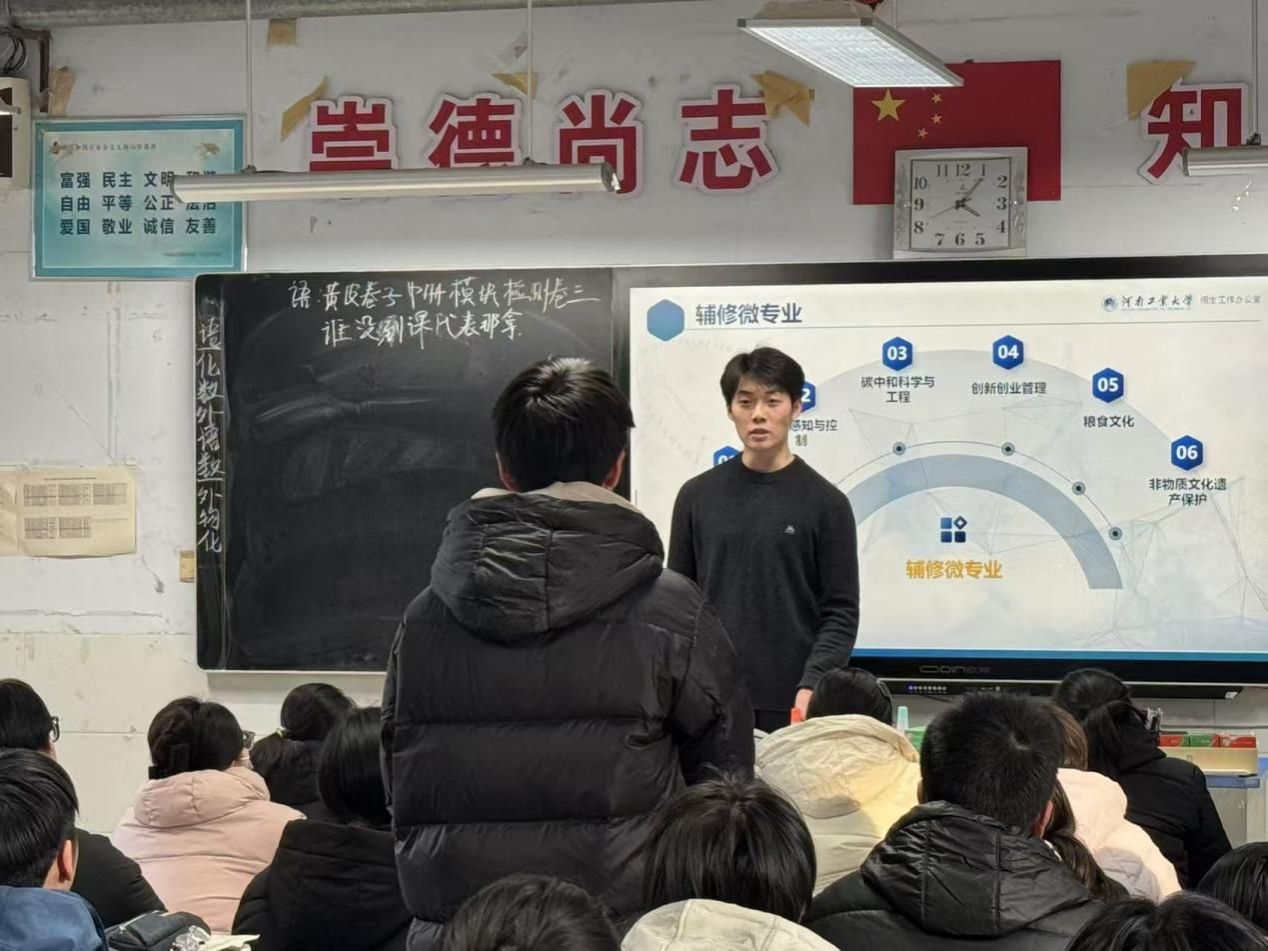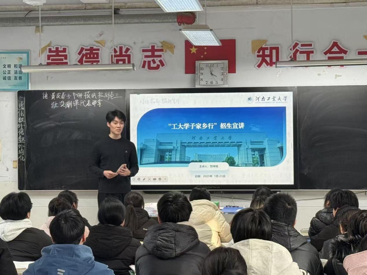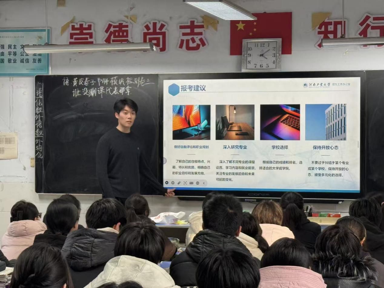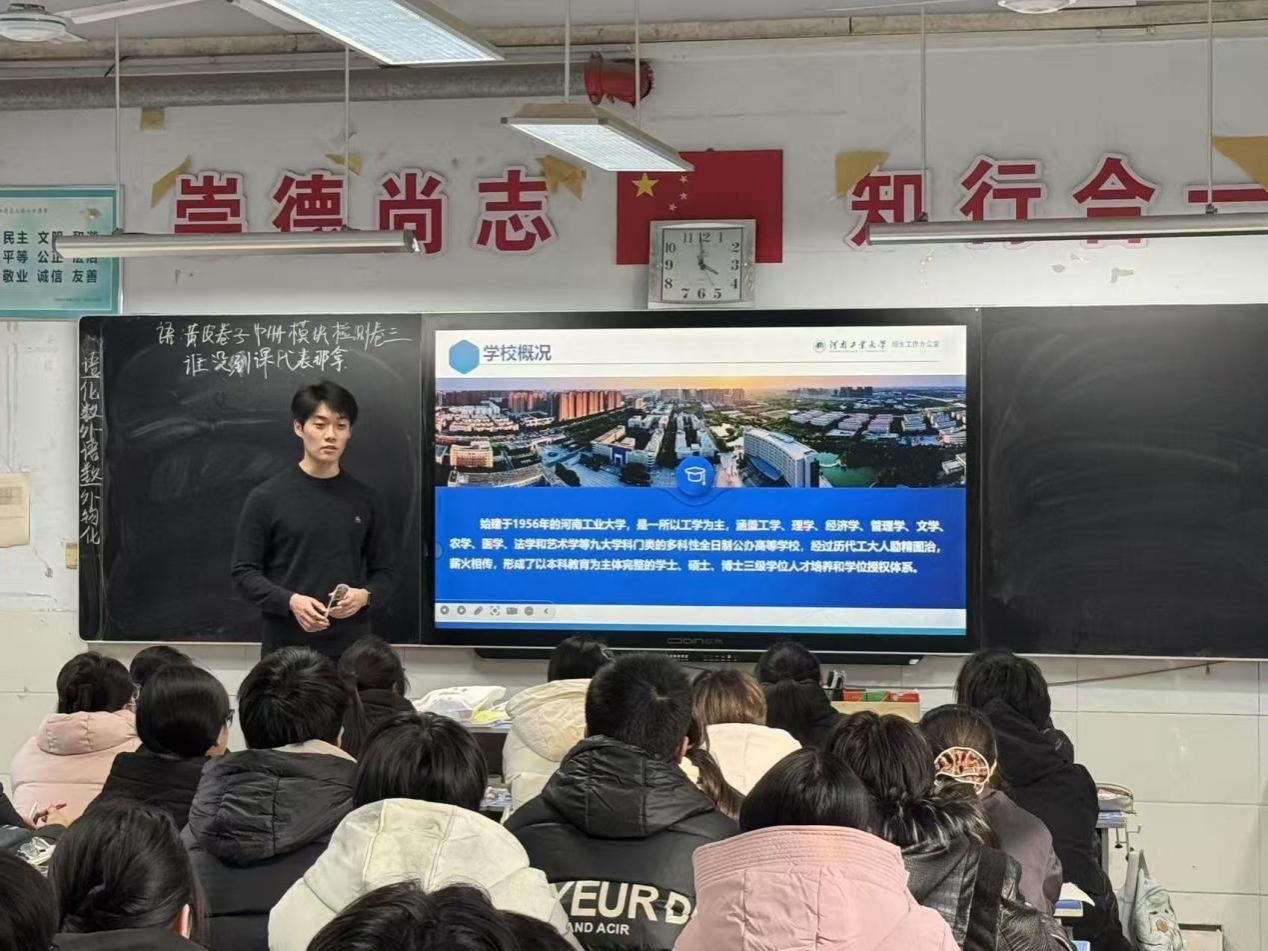 的办学特色、优势学科(如食品科学与工程、粮食工程等王牌专业)、招生政策及校园文化,利用图文并茂的PPT课件,穿插校园风光短视频与学子生活剪影,增强内容直观性;另一方面,结合高二学子阶段性学习要求,整理自身高中学习方法、心态调节技巧及大学生活感悟,设计针对性分享内容。同时,精心策划互动环节,除筛选贴合校情与备考场景的小游戏外,特别设置“理想院校分享+个性化答疑”模块,提前准备相关答疑素材与定制纪念小礼品,为活动顺利开展奠定坚实基础。