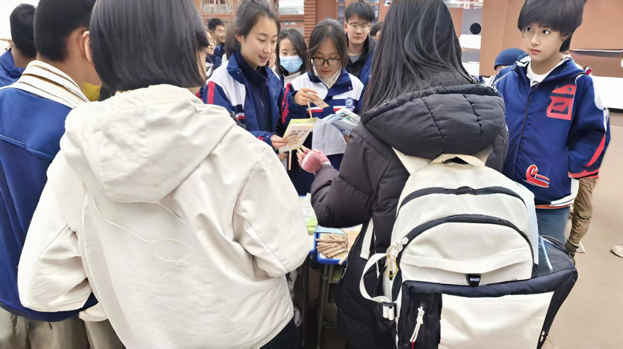 在商丘市第一高级中学校园内,实践团队设立了招生咨询摊位。团队成员热情地向过往学生及家长发放招生简章,详细介绍笔趣阁