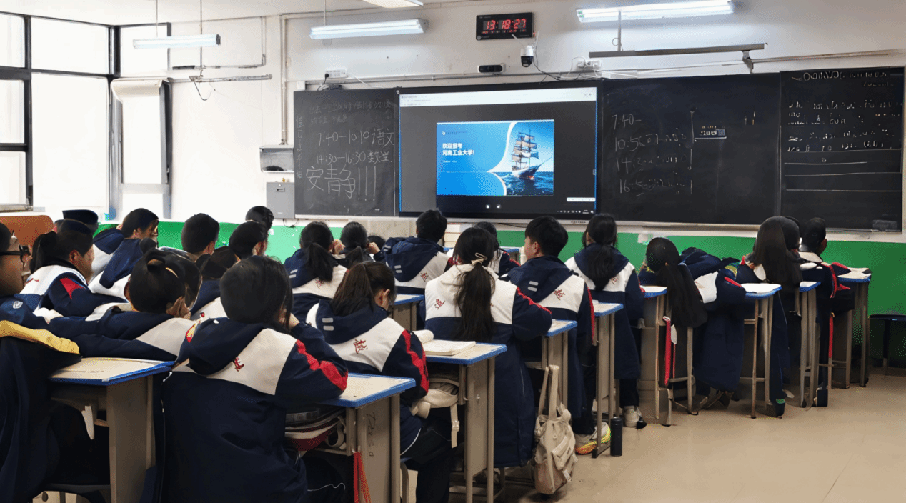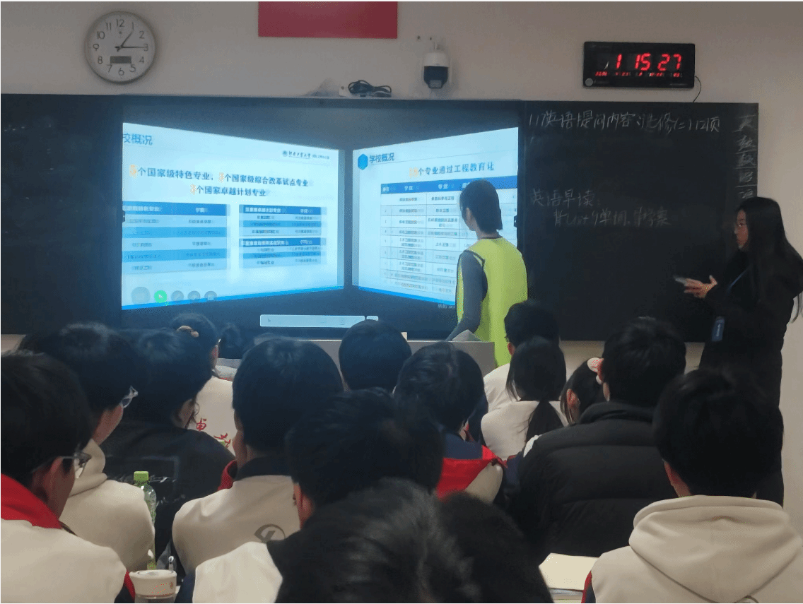 办学历史与学科优势。内容涵盖学校六十余年发展历程、国家级一流本科专业建设点、产学研合作成果等。讲解过程中,团队成员穿插展示校园风光影像与学生自主研发的创新项目案例,并对比分析信息类专业与人工智能类专业的课程差异,帮助学生理解不同专业的培养侧重。
