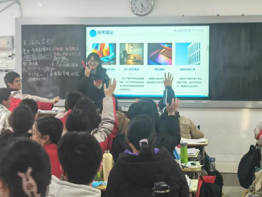 互动环节中,高一34班学生就科研竞赛参与、考研就业方向、校园生活细节等话题踊跃提问。有学生询问"计算机专业需要怎样的数学基础",团队成员孙露涵结合高等数学、线性代数等课程的实际应用进行解答,说明基础数学与专业编程的关联性。另有学生关心"大学社团活动与学业如何平衡",团队成员以自身参与学生会与学科竞赛的经历为例,说明时间规划的重要性。现场交流持续约30分钟,气氛热烈。