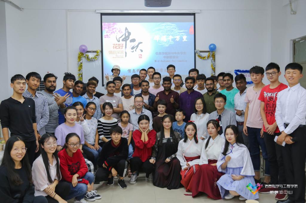 中外学子情谊的大合照。来自孟加拉国的留学生Mehedy Hasan说:“特别喜欢中国的月饼,此刻都不想家了,因为太喜欢中国了。”