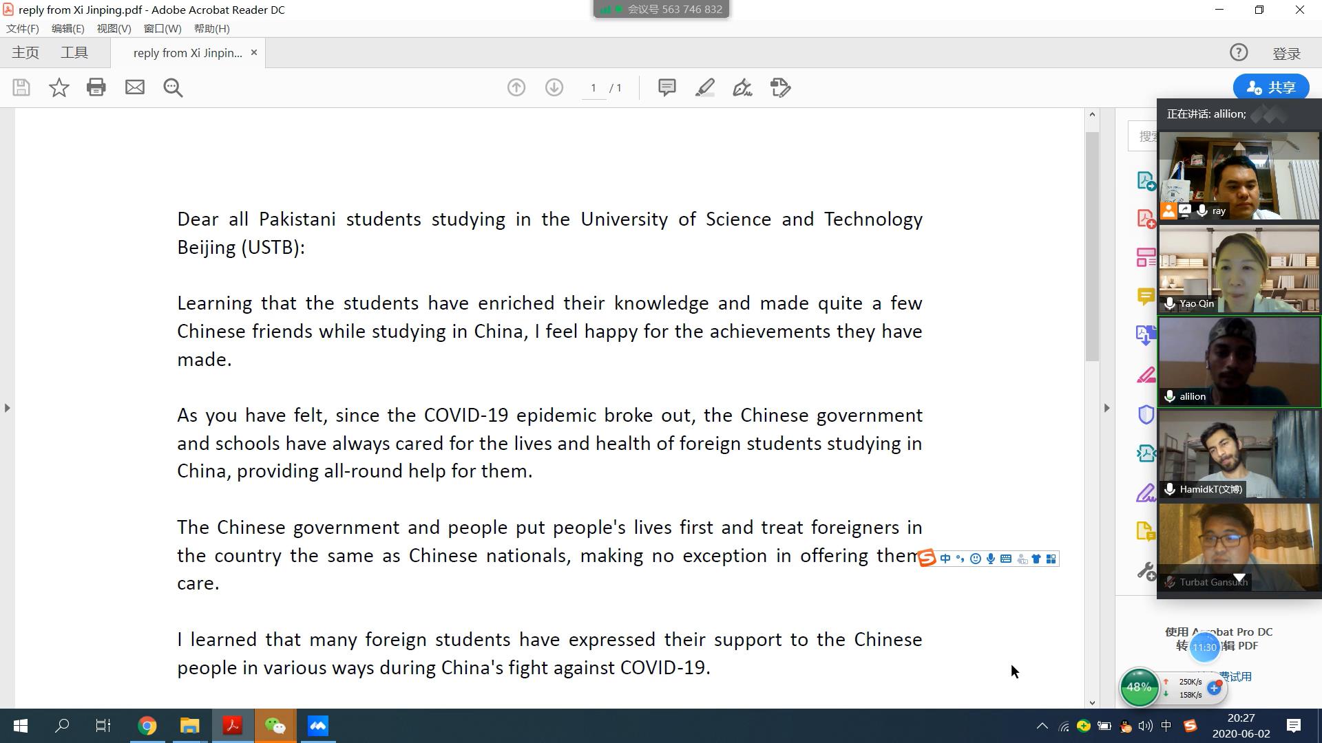 留学生Syed Ali表示非常想回到中国继续学习和生活。作为我校图书馆志愿者的一员,非常想念中国的老师和伙伴们。他在巴基斯坦看到了中国为疫情做出富有成效的努力,希望疫情早点结束,希望大家都健康平安。